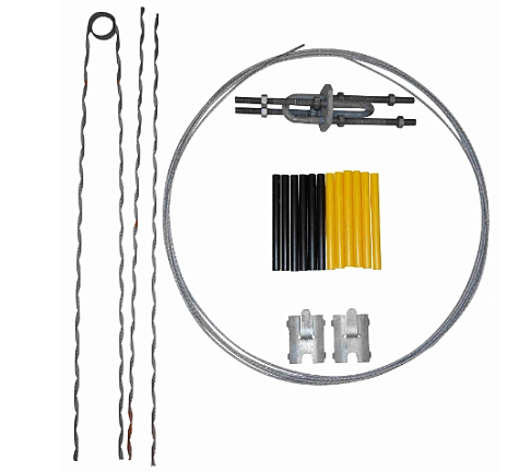 Комплект оттяжки для опор ВЛ-0,4 кВ, без изолятора. Сечение стального троса 25 мм2, длительно допустимая нагрузка 17,5 кН. Все металлические части изготовлены из стали горячей оцинковки, маркеры - атмосферостойкая пластмасса.
